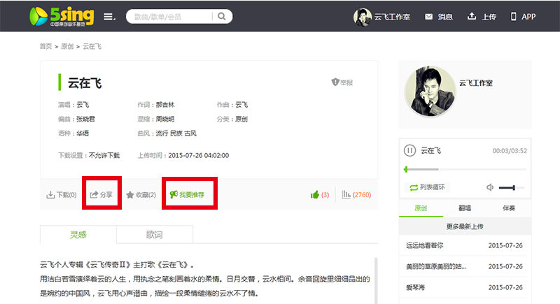 2、目前云飞5sing主打《云在飞》《草原的月亮》《鸿雁飞飞》《回乡姑娘》《阿依古丽》,可以通过点击播放音乐、点赞、收藏增加歌曲人气。(注:【播放音乐】不要单曲循环)
